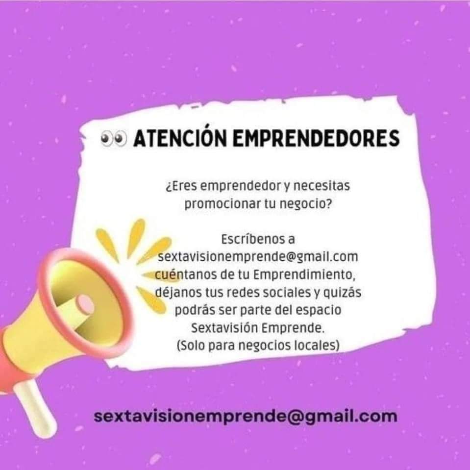 Se parte de #SextavisiónEmprende y escríbenos a sextavisionemprende@gmail.com 📧 mándanos la historia resumida para conocer que hace tu emprendimiento, 👩💻déjanos tus redes sociales y quizás podrás ser parte de estas entrevistas, en noticiero de Sextavisión. 📺