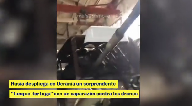 Rusia ha desplegado en el campo de batalla de Ucrania un curioso blindado del que no se tenía hasta ahora noticia: un tanque con caparazón de tortuga. El curioso caparazón cubre toda la parte superior del aparato de tal forma que le da un aspecto de más invulnerabilidad desde el aire.