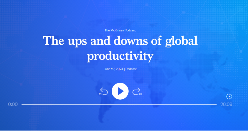 Demographic, regional, and technological shifts all influence the current story of global productivity. On this episode of The McKinsey Podcast, McKinsey senior partners Chris Bradley and Olivia White join editorial director Roberta Fusaro to discuss how best to measure productivity, what’s behind reduced productivity numbers, and what can be done to ramp up productivity rates again.