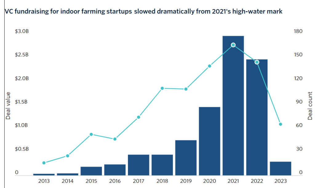 The high-profile bankruptcies in 2023 of Infarm and AeroFarms further cast a chill over fundraising for the sector.